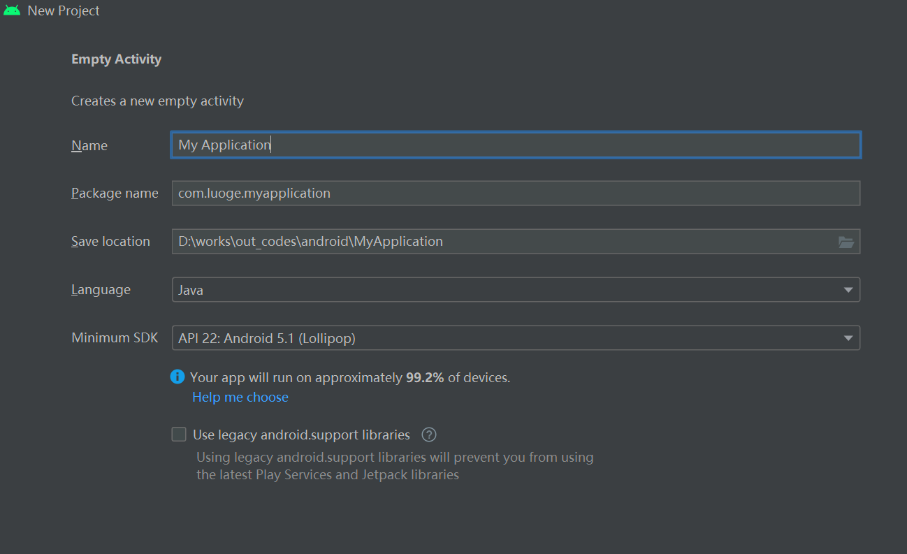 打开AndroidStudio,依次选择菜单File→New→NewProject,弹出CreateNew Project窗口。