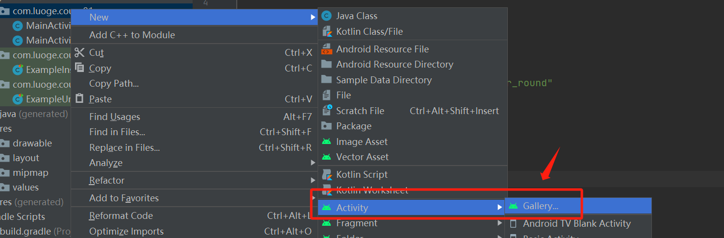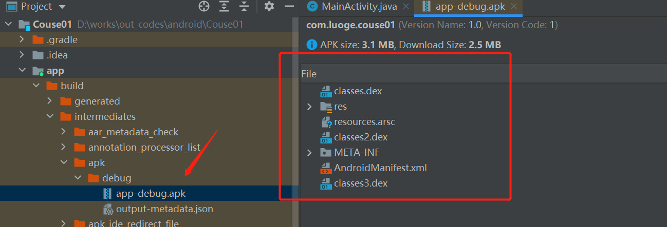 2、app/java这个目录是我们android项目核心代码 的存放地,MainActivity一般为创建一个Android工程时默认的主页面,ExampleInstrumentedTest和ExampleUnitTest是系统生成的测试类
