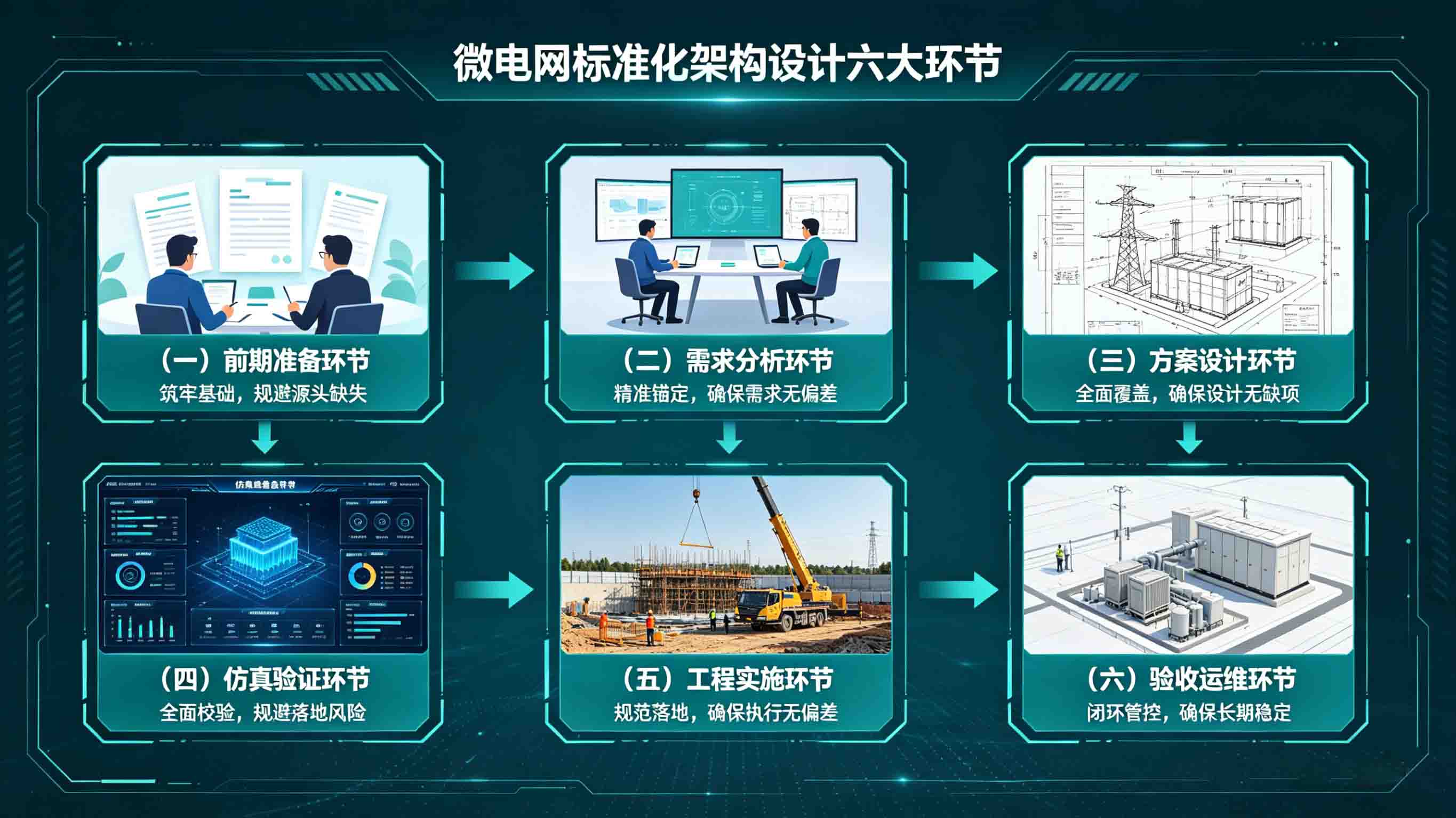 确保微电网标准化架构设计流程的完整性,首要前提是明确"完整流程"的核心框架与边界。微电网标准化架构设计流程以"需求为导向、标准为依据、落地为目标",覆盖"前期准备-需求分析-方案设计-仿真验证-工程实施-验收运维"六大核心环节,形成"输入-设计-验证-落地-运维"的全闭环,每个环节均有明确的标准化要求、输出成果与衔接要点,缺一不可。