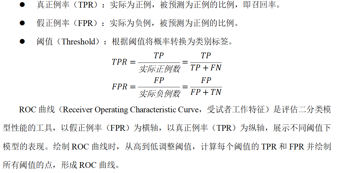 AUC值代表ROC曲线下的面积,用于量化模型性能。AUC值越大,模型区分正负类的能力越强,模型性能越好。AUC值=0.5表示模型接近随机猜测,AUC值=1代表完美模型。