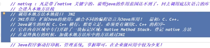 native 方法是在 Java 中通过 native 关键字声明的,用于调用非 Java 语言,如 C/C++ 编写的代码。Java 可以通过 JNI(扩展Java的使用,融合不同的编程语言为Java所用),也就是 Java Native Interface 与底层系统、硬件设备、或者本地库进行交互。
