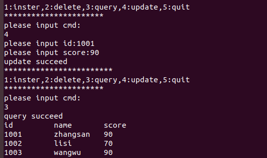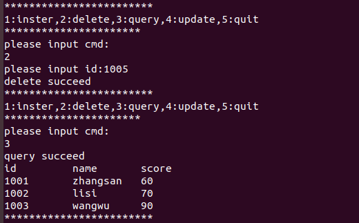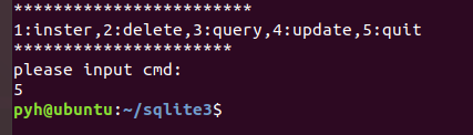 // 4. 死循环:菜单界面 while(1) { printf("************************\n"); printf("1:inster,2:delete,3:query,4:update,5:quit\n"); printf("**********************\n"); printf("please input cmd:\n"); // 读取用户输入的命令 scanf("%d",&cmd); // 根据命令执行对应功能 switch(cmd) { case 1: do_insert(db); break; // 插入 case 2: do_delete(db); break; // 删除 case 3: do_query2(db); break; // 查询 case 4: do_update(db); break; // 修改 case 5: sqlite3_close(db); exit(0); // 退出 default: printf("cmd err\n"); } } return 0;}