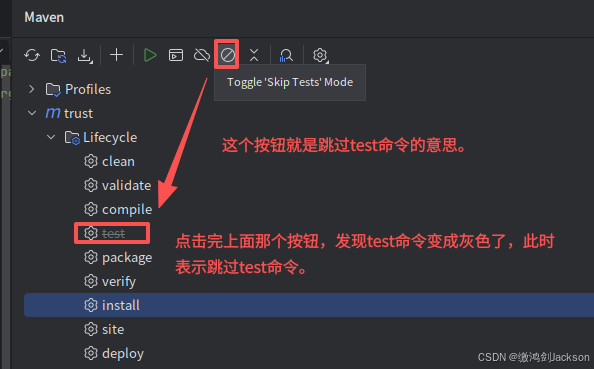 我们的目的是将 jar 包安装到本地仓库,而非运行测试。因此,可以在执行命令时声明跳过测试。