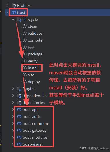 不需要手动去判断依赖顺序(先装A再装B)。我们只需要对父项目 执行