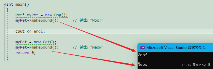 尽管 myPet 是 Pet 类型的指针,但它指向的是一个**Dog** 对象。因此,当你调用 makeSound() 方法时,会调用 Dog 类的 makeSound() 方法,而不是 Pet 类的 。(这就是多态)