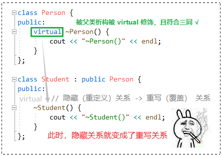 子类都会跟着父类变身成 virtual,那么现在这两个析构函数还是隐藏关系吗?