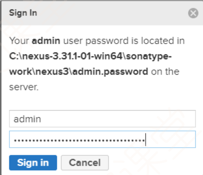 点击右上角的signIn,用户名是admin,我们第一次登录的密码是在sonatype-work\nexus3\admin.password文件下,复制粘贴即可,登录成功后他会让你设置新密码