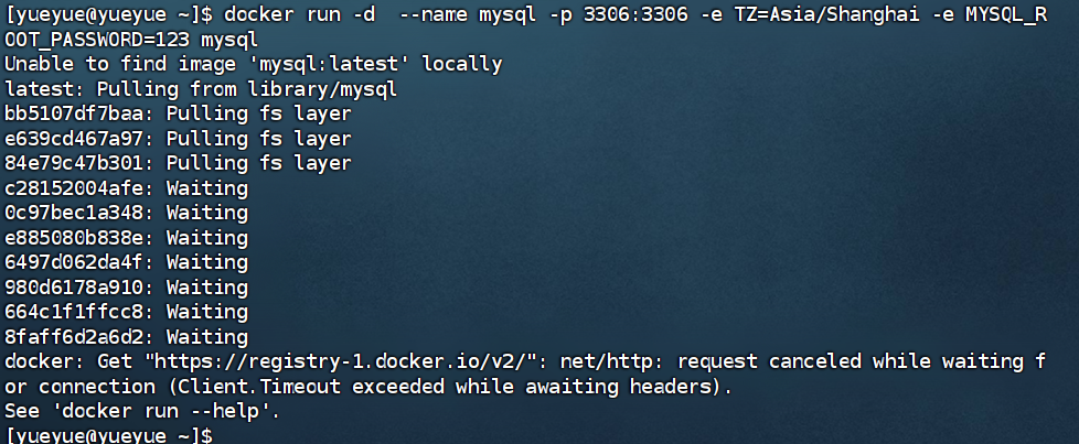 docker run -d --name mysql -p 3306:3306 -e TZ=Asia/Shanghai -e MYSQL_ROOT_PASSWORD=123 mysql