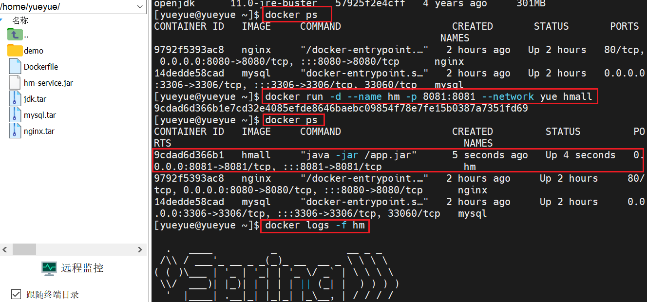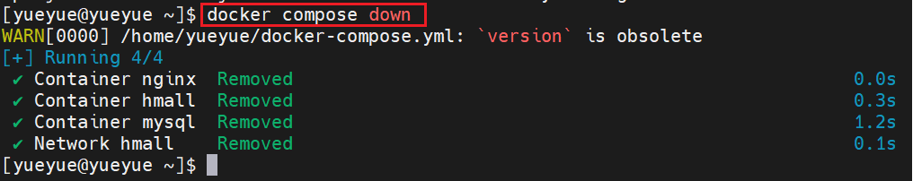 执行命令docker rm -f nginx hm mysql,将之前部署的容器删除)------执行命令docker compose up -d,实现一键部署(如下图)------执行docker compose ps,查看项目下的所有进程------
