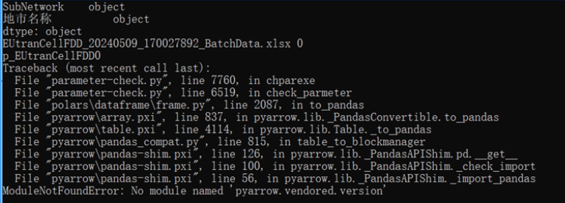 修改打包命令为:pyinstaller -F parameter-check.py --hidden-import pyarrow.vendored.version