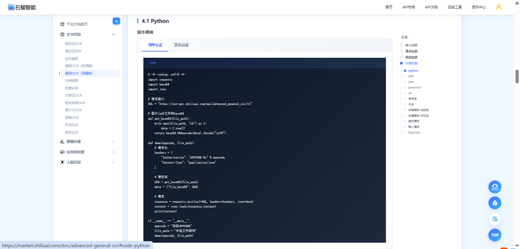 # 支持免费在线体验,API文档清晰,提供多种接入语言示例(如python、js、C#、java、php等),以及自动化脚本语言(如天诺、懒人精灵、按键精灵、易语言、EasyClick、触动精灵等)