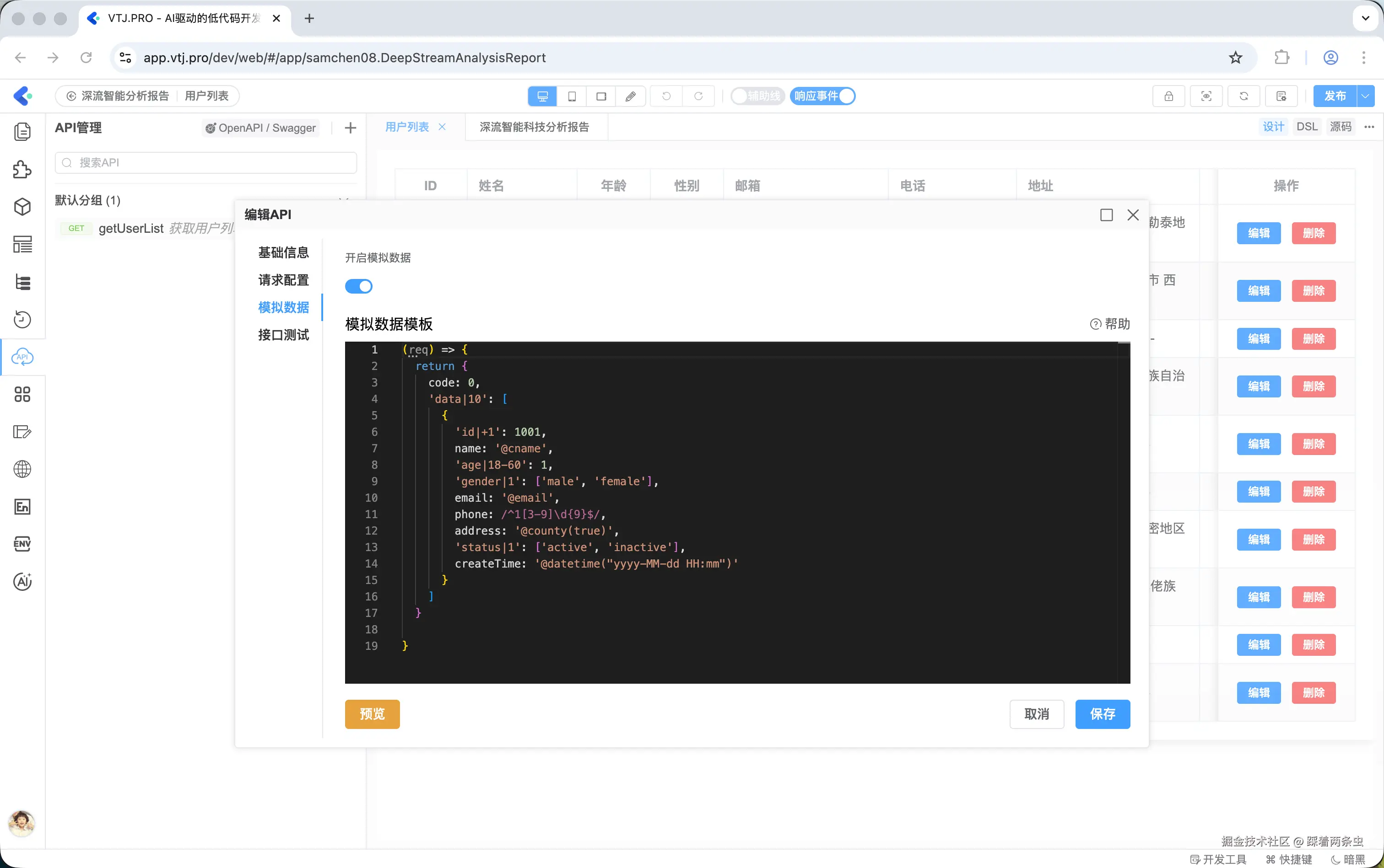 在后端接口尚未就绪时,模拟数据功能可以让前端开发和调试不受阻碍。只需开启"模拟数据"开关,并编写模拟数据模板即可。模拟数据采用 Mock.js 实现,语法简单且功能强大,可以生成各种类型的数据。
