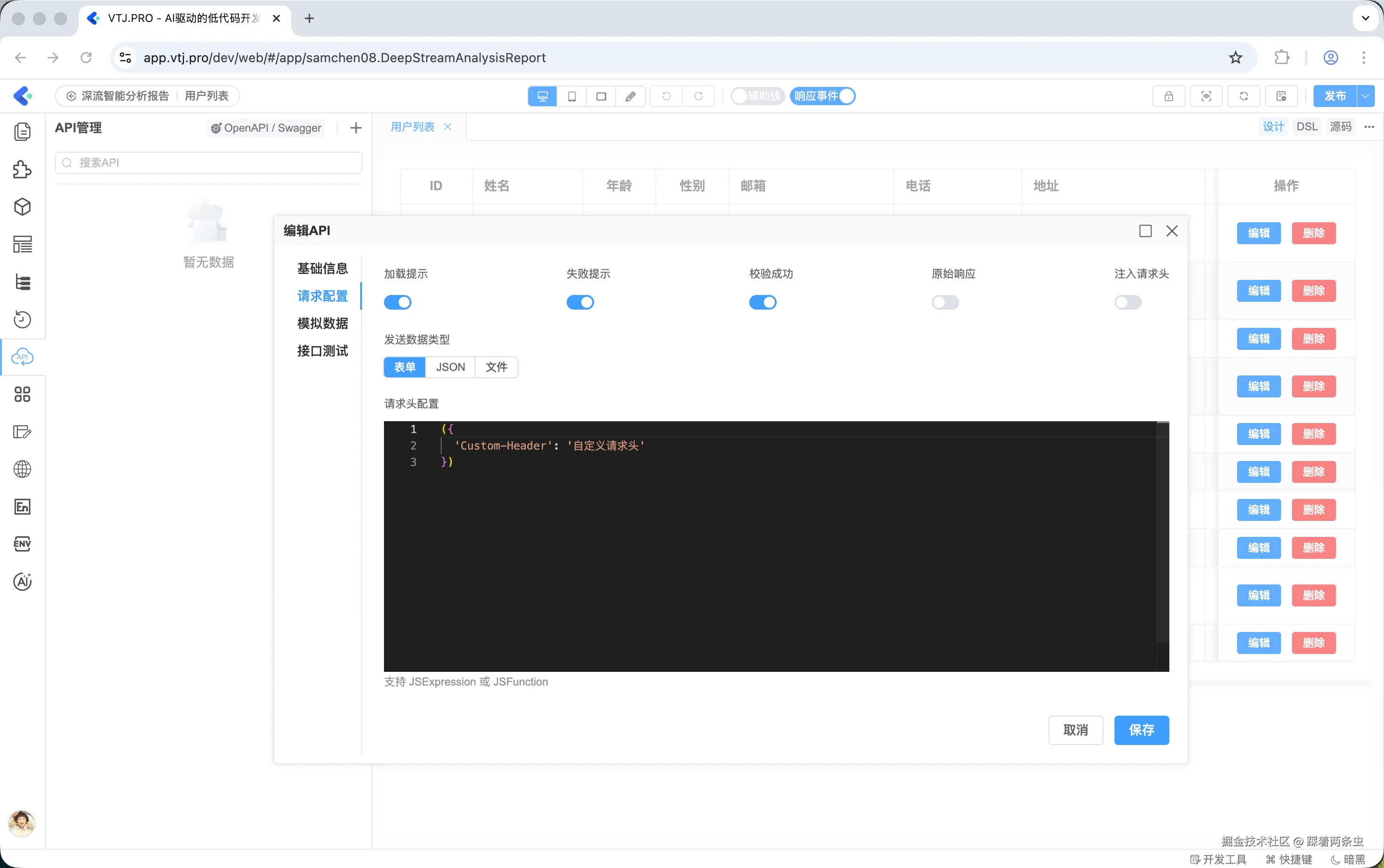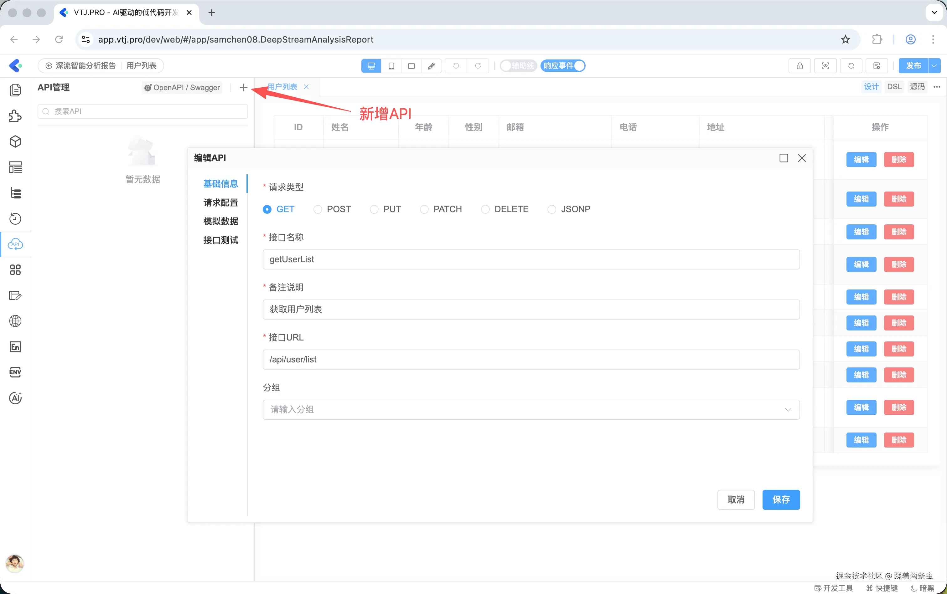 VTJ.PRO 的 API 管理功能正是为了解决这一痛点而设计。它提供了一个可视化的 API 配置面板,让开发者可以通过简单的操作完成接口的配置与管理,自动生成对应的调用代码,大幅减少重复性操作,将更多精力专注于业务逻辑实现。