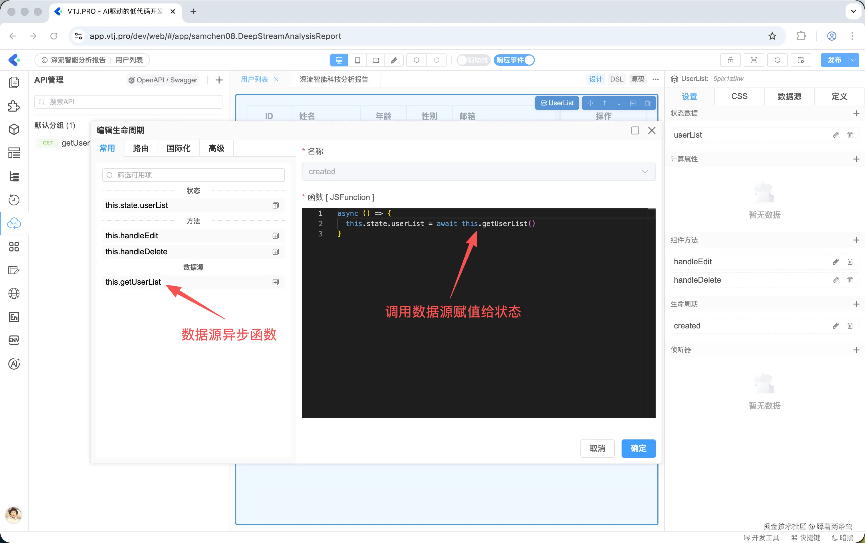 例如,可以在按钮的 click 事件中绑定数据源函数,实现点击按钮后调用接口的功能。整个过程无需手写任何 JavaScript 代码,完全通过可视化配置完成。