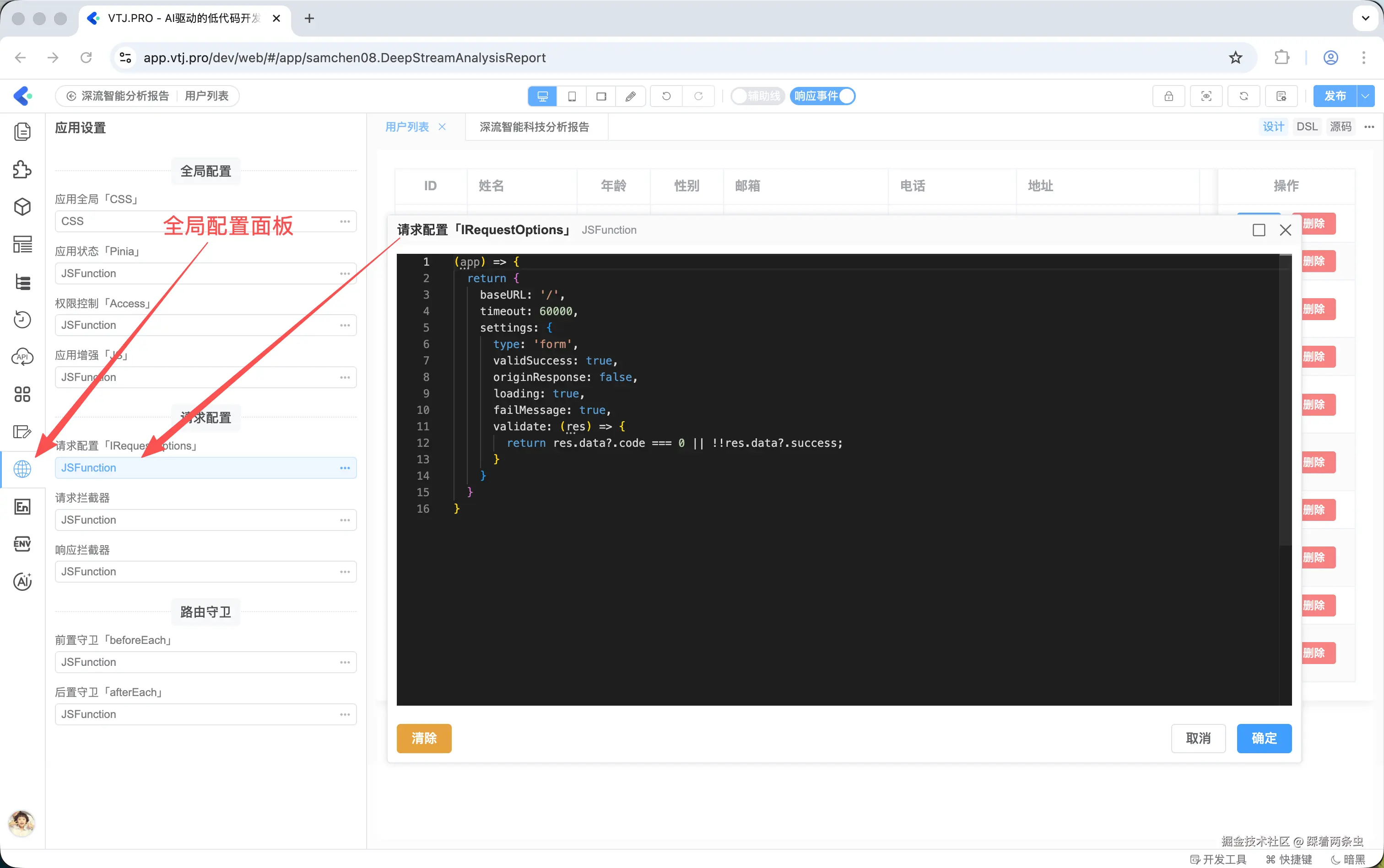 在设计器主界面,点击左侧菜单中的"全局设置"入口,进入应用全局设置页面,选择"请求配置"选项卡即可进行配置。