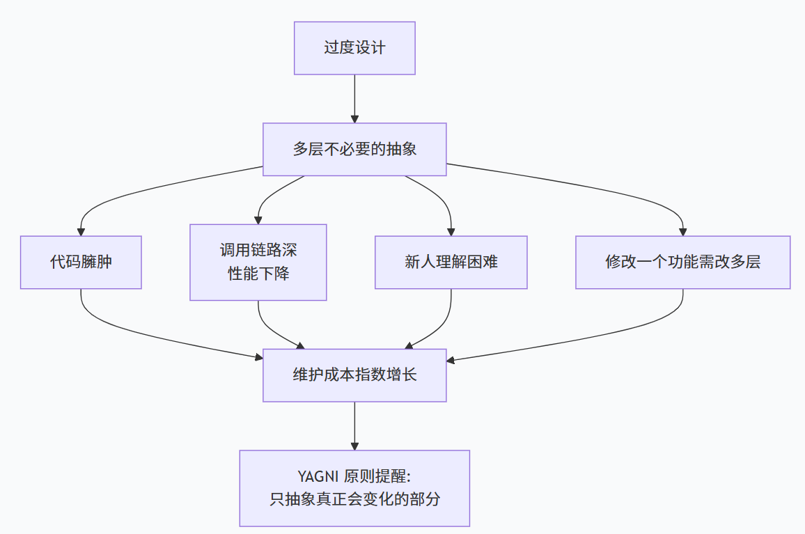 学习成本:过度抽象的代码,新人需要花大量时间理解"这层是干什么的"