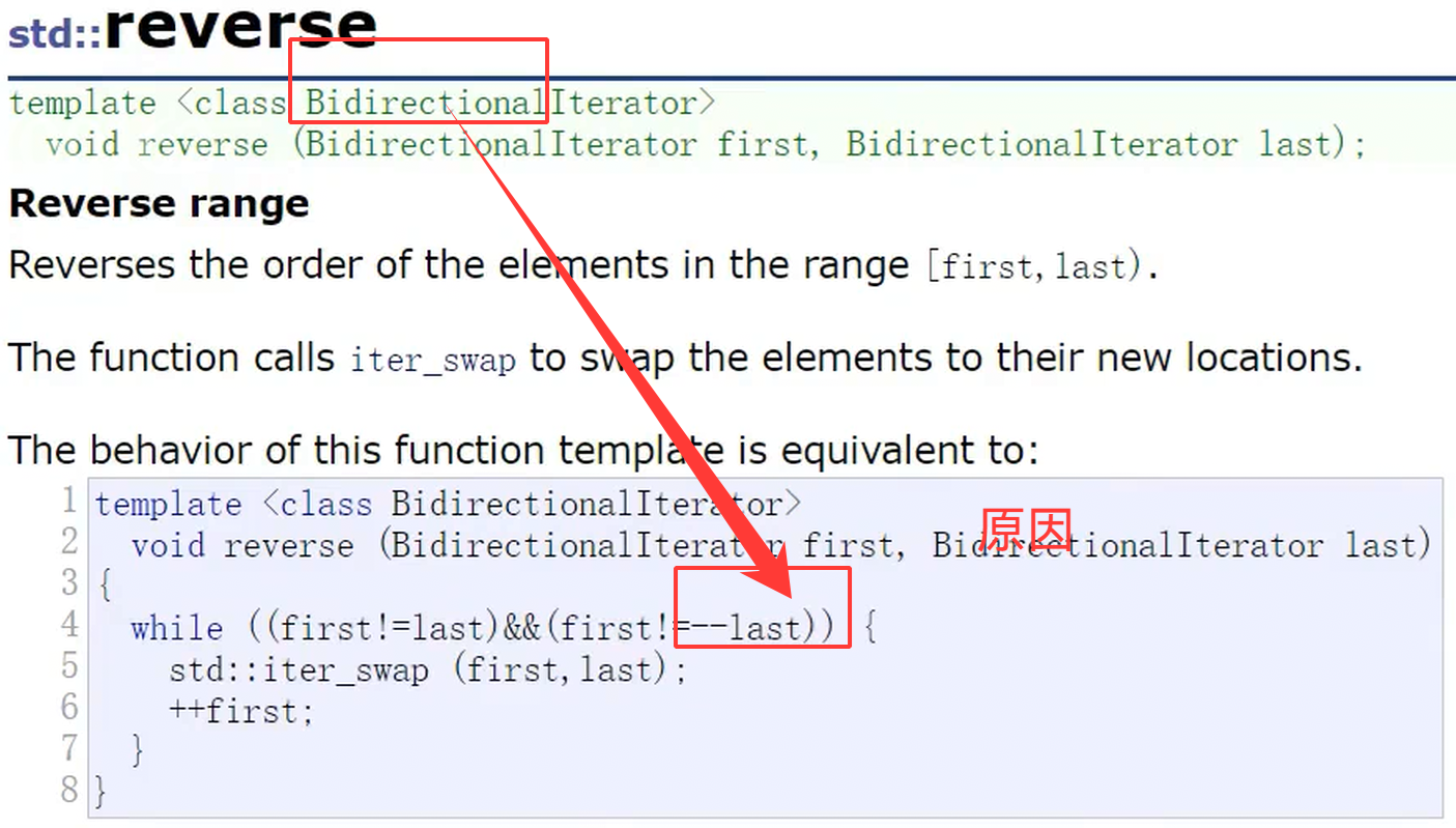 第二个例子就是reverse逆序算法 。它的底层实现需要用到**--**操作,所以只要求迭代器能够双向移动,也就只需要支持双向迭代器就够了。
