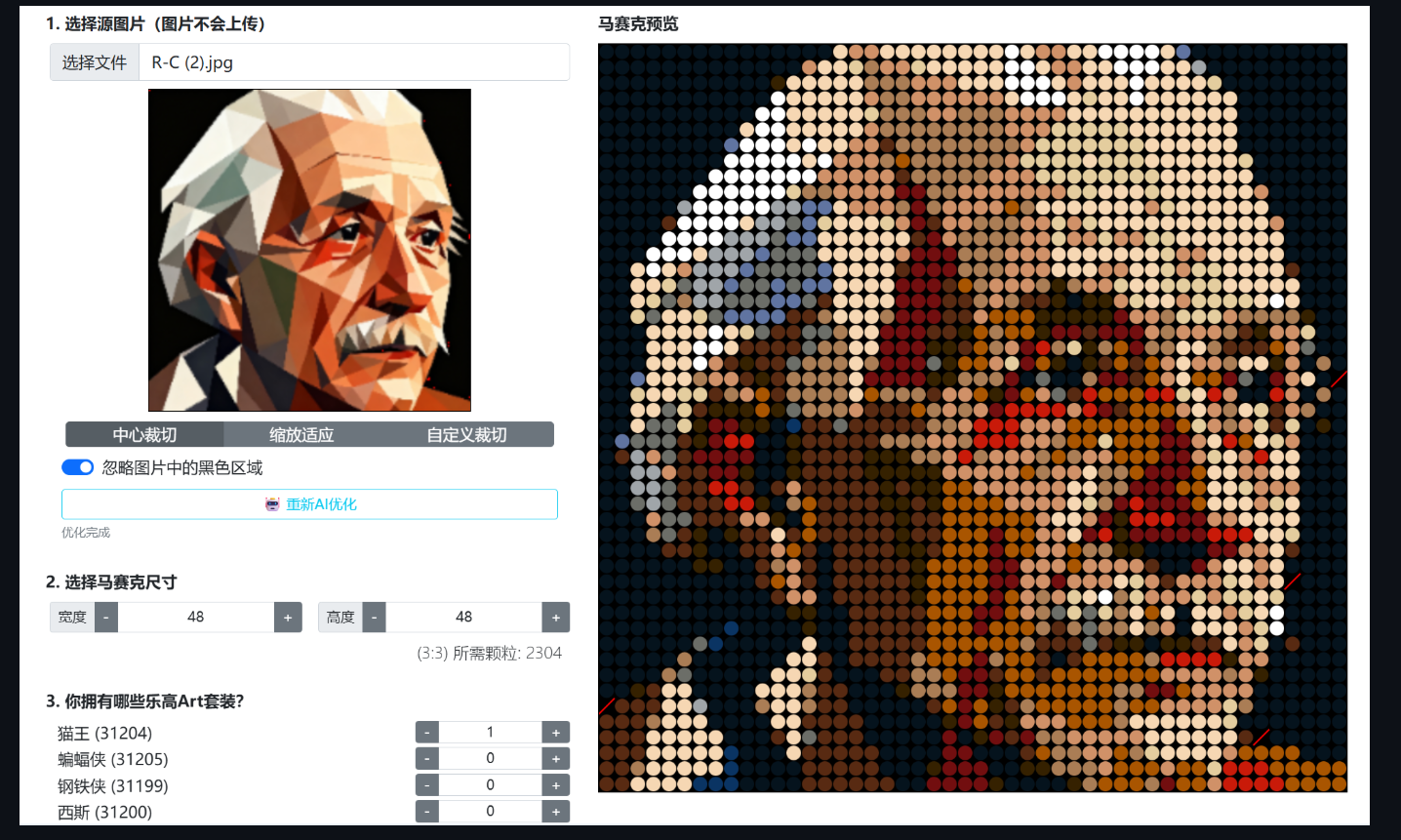 - 颜色匹配 :将每个像素的颜色与你选择的乐高套装中所有可用颜色进行比较,计算颜色距离(RGB空间中的平方欧氏距离)