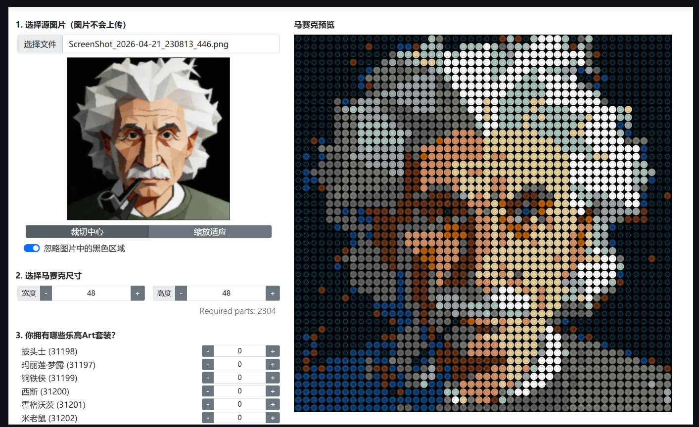 这是一个100%客户端运行 的开源网络应用,可以将你自己的图片转换成乐高(LEGO)积木马赛克拼贴图,并生成可下载的PDF拼搭说明书或长图说明书。你可以使用现有的乐高Art系列套装来拼搭出完全自定义的马赛克作品。