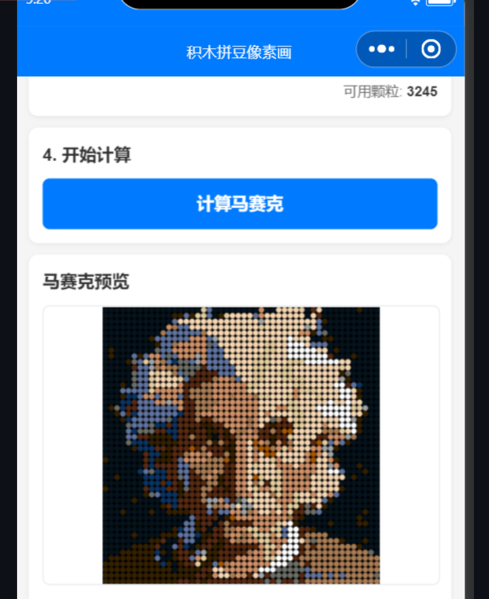 本应用参考了Christoph Fritzsch开源项目 custombrickmosaic.github.io 进行大量深度定制开发,目前已经达到适应大部分图片生成像素画,还带有功能完全一致的微信小程序版本。用户可以在手机上完成从图片上传到下载说明书的全部流程,所有计算均在客户端完成,图片不会上传到任何服务器。