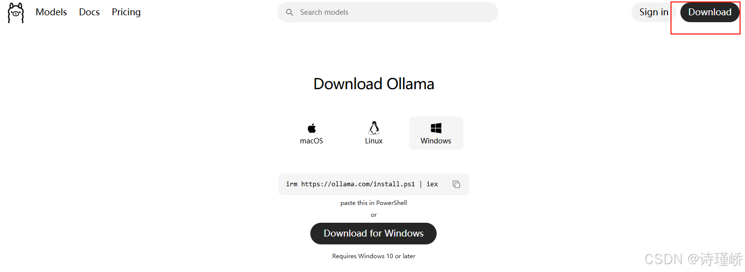 安装 Ollama: 访问 Ollama 官网 下载对应系统(Windows/Mac/Linux)的安装包并傻瓜式安装。