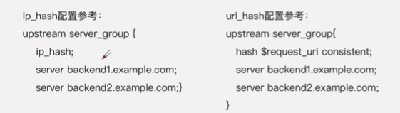 - url_hash(url的hash值)ip_hash(ip的hash值least_conn(最少连接数)