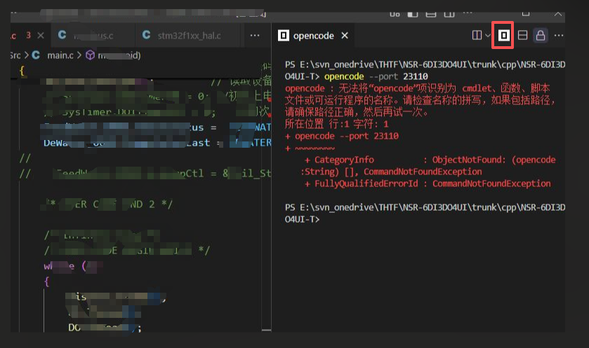 一开始在vscode的扩展商店搜索"opencode"点击安装。安装成功后,在窗口的右上角会出现一个小方块样子的opencode的图标。可是点击后 提示错误如下: