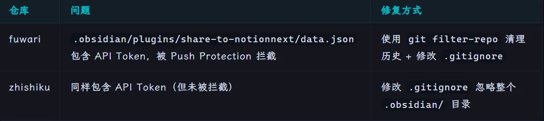有趣的是,同步排查另一个仓库 zhishiku 时,我发现它虽然也安装了同样的插件、同样包含 API Token,却没有被拦截。这可能是因为 Token 格式(ntn_ 开头)的识别率不同,或者该仓库的 Push Protection 设置没有 fuwari 那么严格。但不管怎样,这确实是一个安全隐患。