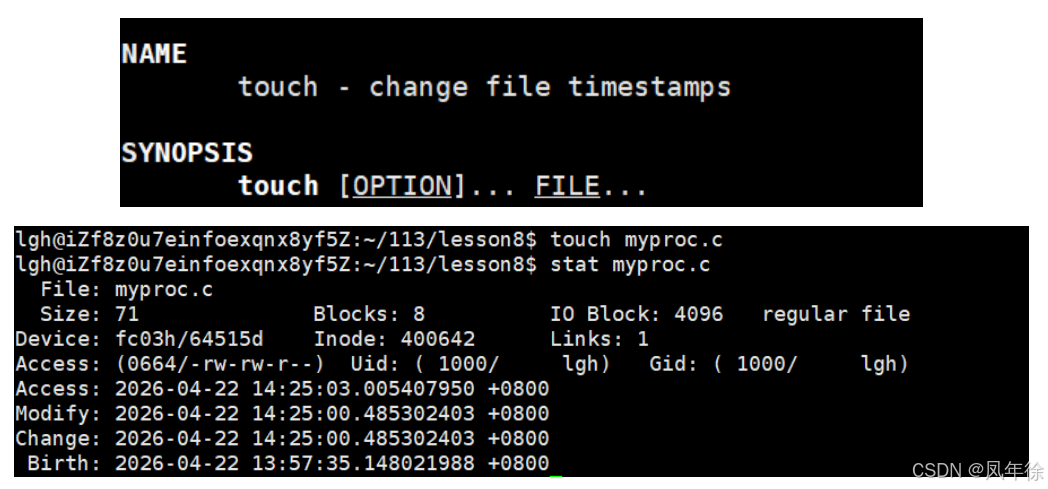 touch filename # 将 filename 的 Access、Modify、Change 都改为当前时间