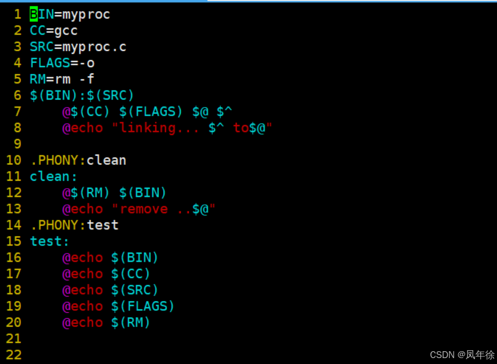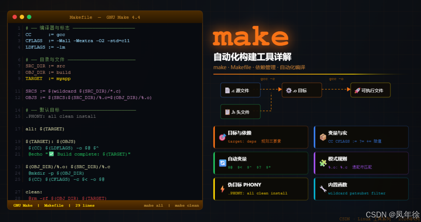 | 伪目标 | 用 .PHONY 声明,总是执行其命令(如 clean) |