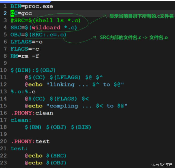 SRC=$(wildcard *.c) #两种方式都可以 显示当前目录下的所有.c文件