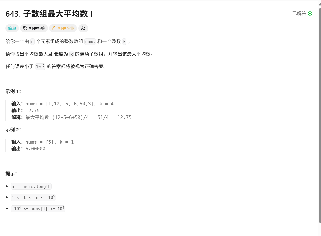 本篇文章给大家带来的是 LeetCode 第 643 题------子数组最大平均数 I 。这是一道 滑动窗口的经典入门题 ,虽然题目以子数组求平均数为背景,但核心思想「固定长度窗口的滑动」是所有滑动窗口问题的通用解法,掌握后可以轻松解决类似问题。