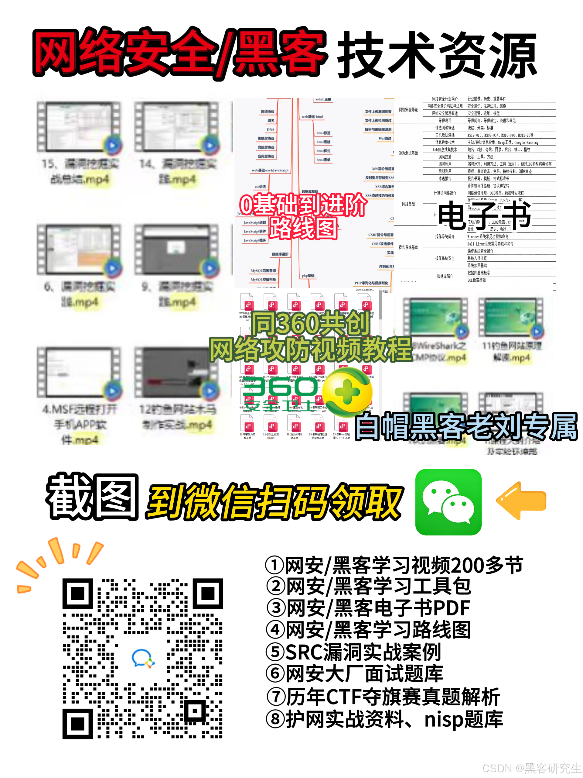 网上虽然也有很多的学习资源,但基本上都残缺不全的,这是我们研发的的网安视频教程,内容涵盖了入门必备的操作系统、计算机网络和编程语言等初级知识,而且包含了中级的各种渗透技术,并且还有后期的CTF对抗、区块链安全等高阶技术。总共200多节视频,100多本网安电子书,最新学习路线图和工具安装包都有,不用担心学不全。