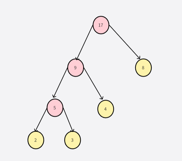 (2) 在森林中选出两个根结点的权值最小的树合并,作为一棵新树的左、右子树,且新树的根结点权值为其左、右子树根结点权值之和;