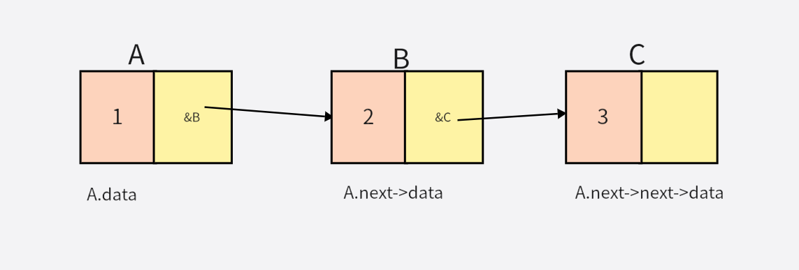 ` A.next=&B; //让A和B相连,通过让A节点中的指针域保存B节点的地址`