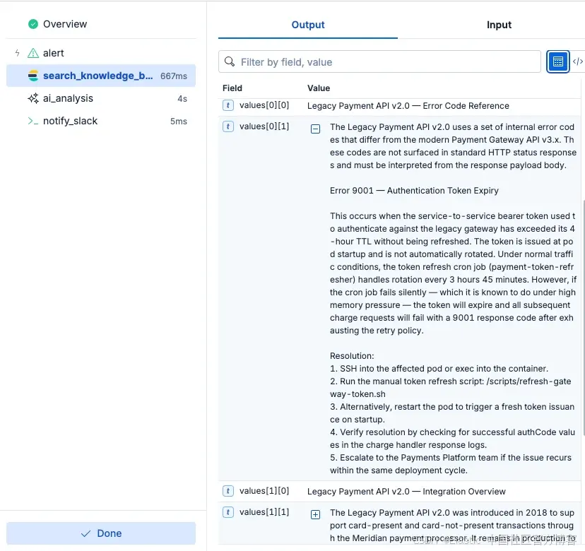 - 机构记忆:它会搜索内部 runbook、Jira 工单和 Confluence 文档(已接入 Elasticsearch)。例如发现 "Payment 服务 503 错误" 上个月通过轮换某个密钥解决过。