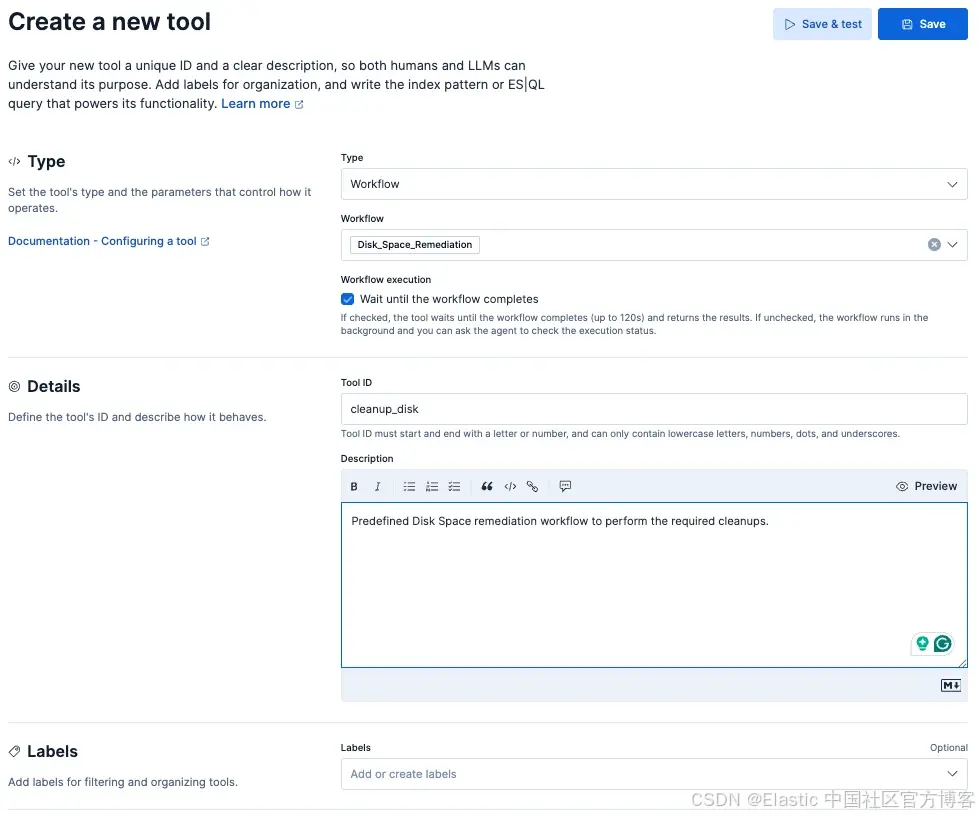 MCP 是一种标准,使你的 Agent 能够安全地连接到外部系统。你不是给 Agent 原始 shell 访问权限,而是为它提供一个名为 cleanup_disk 的 "Tool",该 Tool 在外部系统中绑定了特定命令。可以定义不同类型的工具,包括 Workflows 、ES|QL 查询或 index patterns,这些可以向 Agent 暴露一组索引。例如,不是在工作流中作为一个步骤去搜索 'sre-knowledge-base' 索引,而是可以创建一个工具,使 Agents 在被要求进行分析时能够自主查询数据。Elastic 可以通过 MCP 将工具提供给其他系统,也可以提供给在 Agent Builder 中定义的原生 Agents。例如,一个 'cleanup_disk' 工具直接映射到我们在场景 B 中构建的确定性工作流,可作为修订后的 AI 驱动修复流程的一部分使用: