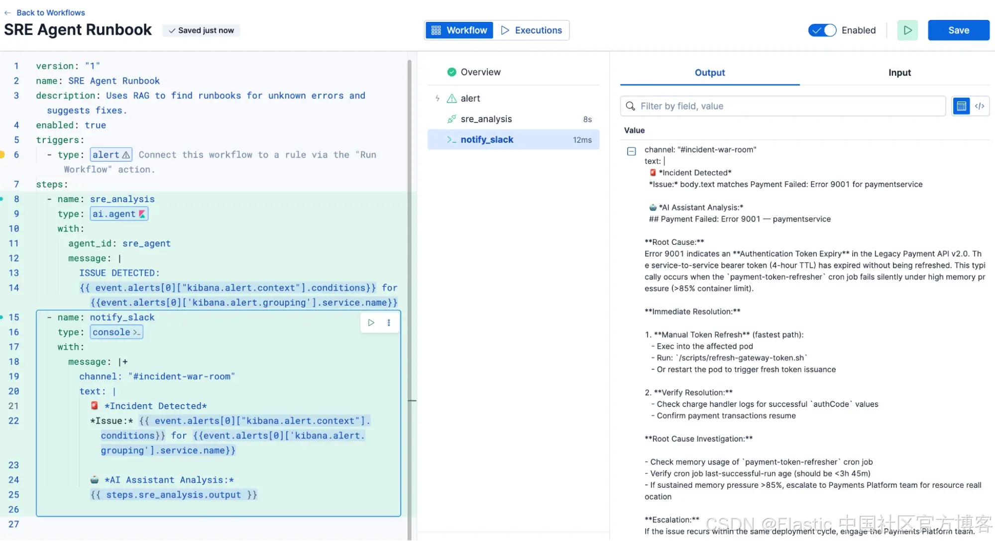 图 7:在 Elastic Workflows 中使用自定义 SRE Agent