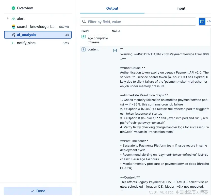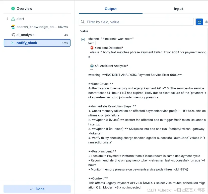 图 2:使用 Elastic Workflows 对错误进行自动化 AI 分诊的输出