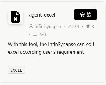 在工具市场界面中,找到 agent_excel 插件,点击"安装"按钮即可完成安装。整个过程不到一分钟,无需任何技术配置。