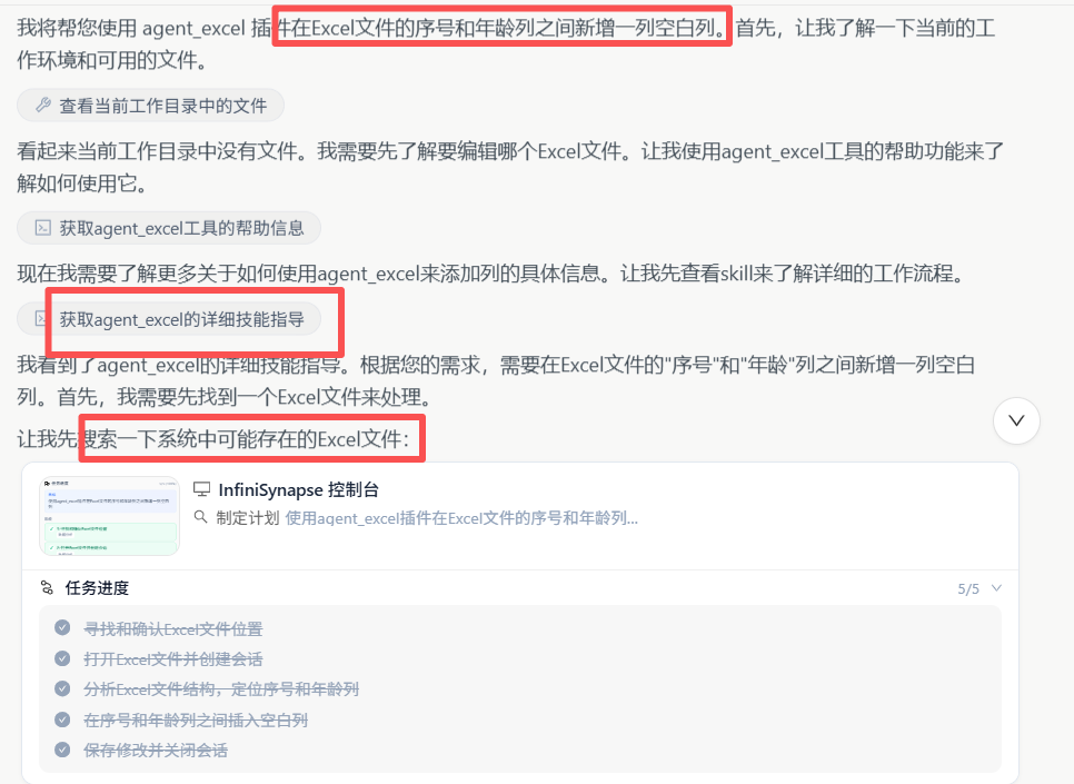 AI 会自动调用 agent_excel 插件,将你上传的excel文件修改完成后再返回,最后你会得到按照要求修改后的excel报告。