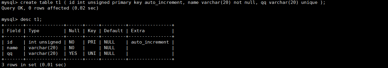 1.任何一个字段要做自增长,前提是本身是一个索引(key一栏有值)