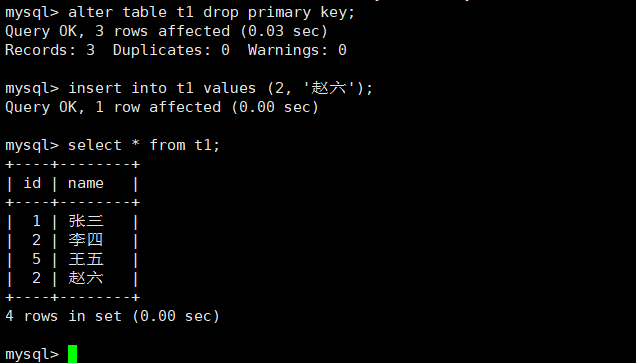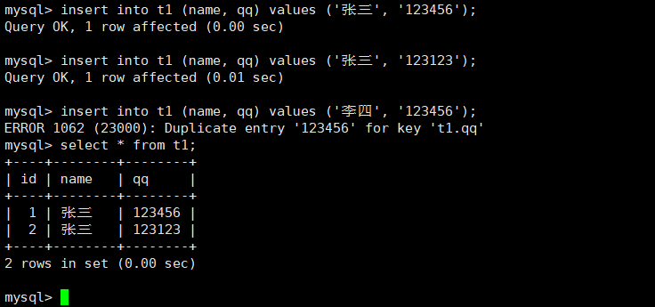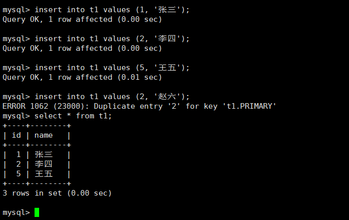 可以发现只允许插入唯一id值(主键约束:主键对应的字段中不能重复,一旦重复,操作失败)