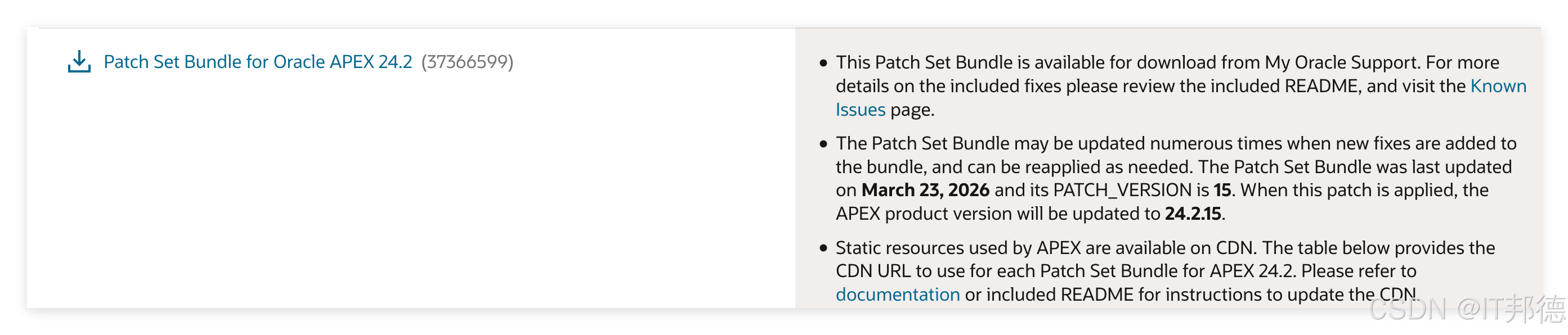 Oracle APEX 24.2版本已于2025年1月15日发布,补丁集束会持续更新以包含新修复,可按需重复应用,最新更新于2026年3月23日,版本号为15,应用后APEX版本将升至24.2.15。