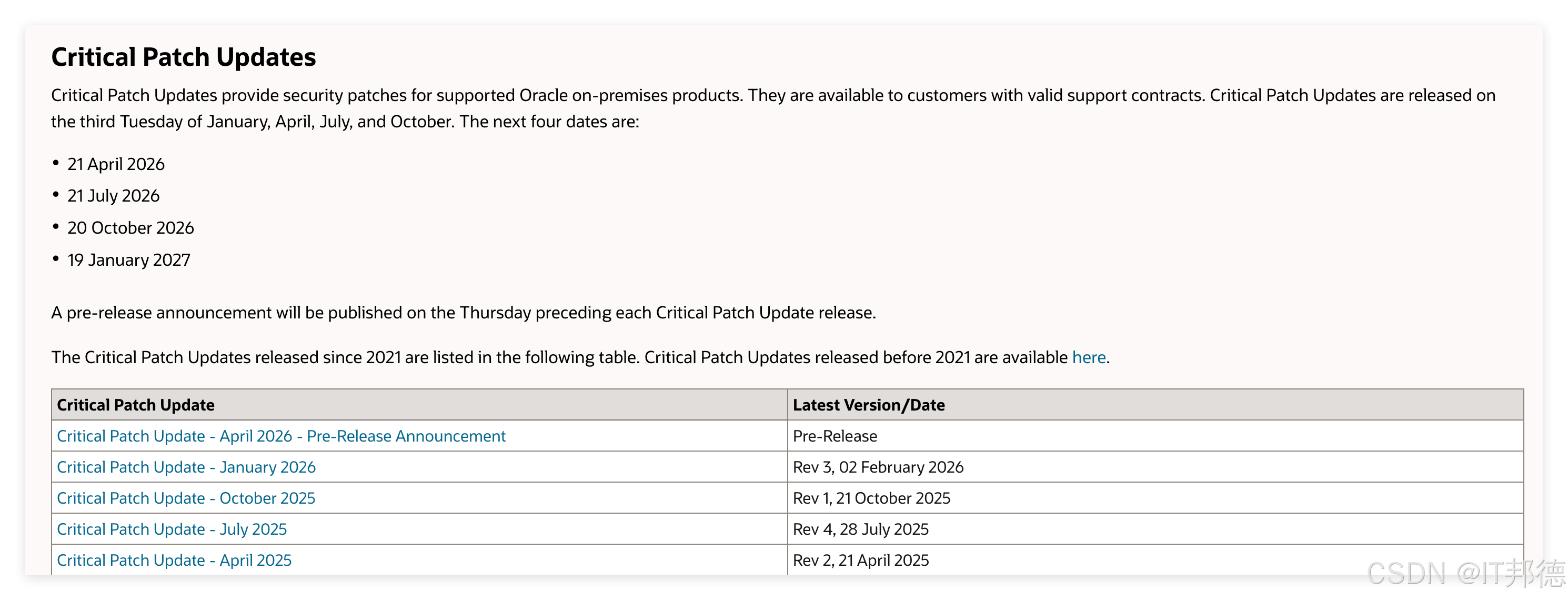 Oracle严格遵循其季度发布周期,关键补丁更新固定在每年1月、4月、7月和10月的第三个星期二发布。