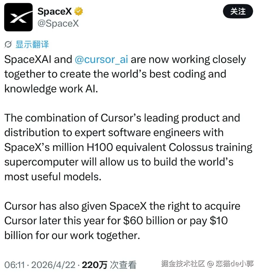 这其实也是 Cursor 最值钱的部分,这次 SpaceX 给 Cursor 的估值和合作,不是它现在的产品形态有什么特别,现在的 Cursor 3 形态和 Codex app、Claude Code Desktop、Trae solo 没什么区别,支撑它 600 亿估值的,更多是它的这些用户和数据,而这些数据也可以帮助 X AI 进一步得到提升: