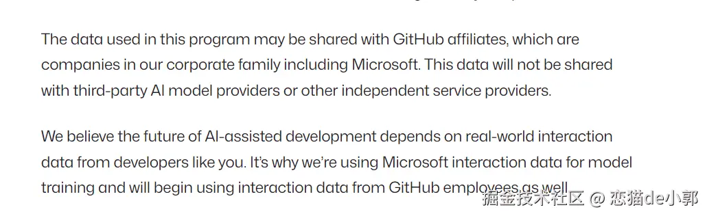 重点是,虽然数据不会分享给第三方AI提供商,但会分享给 GitHub 关联公司(也就是微软),这其实也可以看出,AI 时代数据的重要性,特别是不断更新中的数据的重要性。