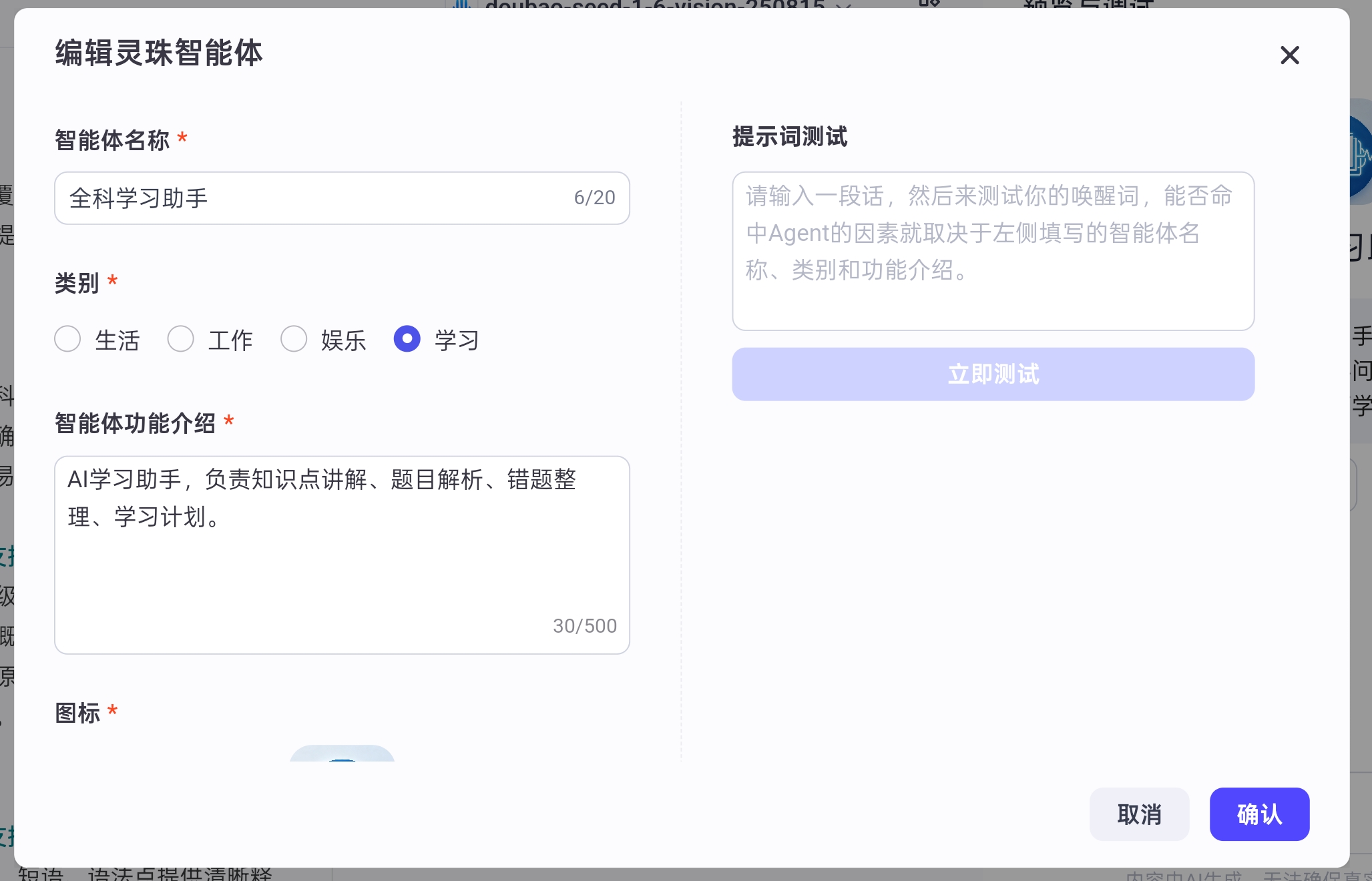 - 新建智能体,命名为全科学习助手,分类选择「学习」;