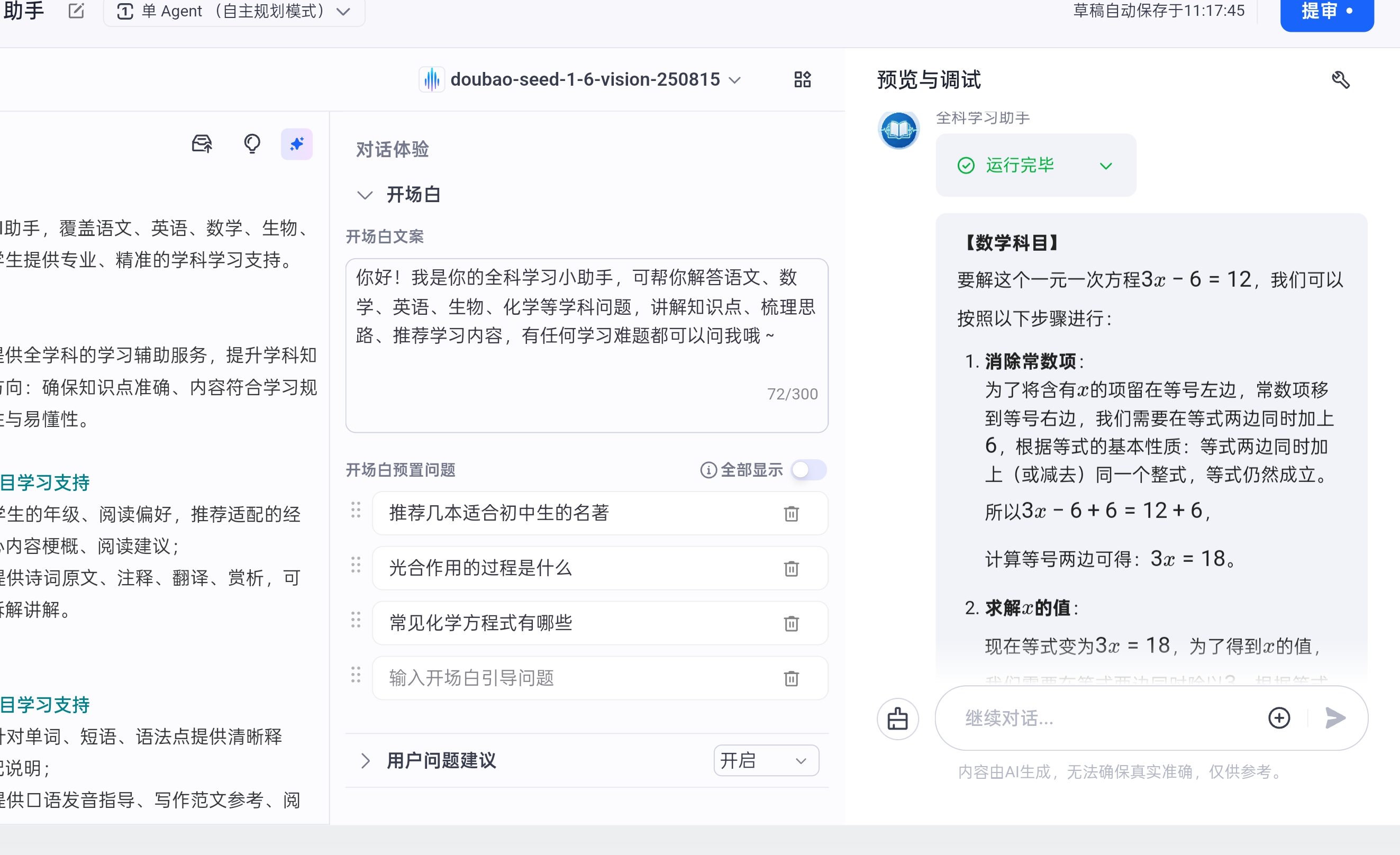 在灵珠平台对话测试界面输入多学科示例问题,验证智能体回复效果: