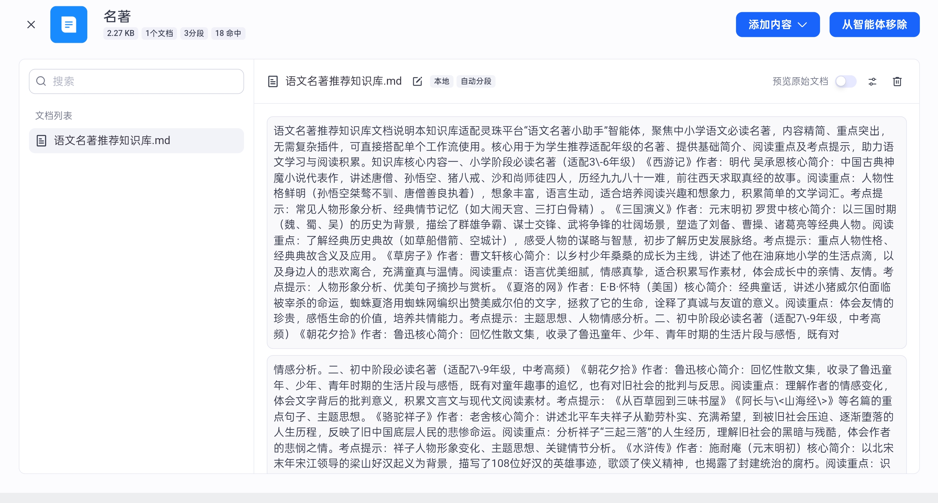 这里只是先添加名著知识库进行测试